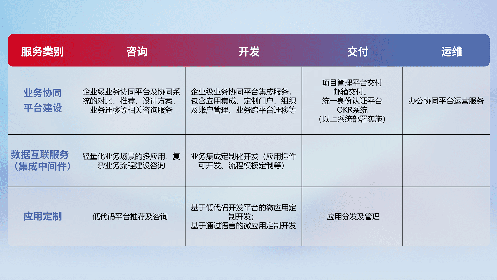 针对钉钉、、企微、、、、IDaas等平台级产品提供产品的规划、、方案、、、、交付、、、定制化开发等服务,,实现如统一协同办公、、、智能客户服务、、混合会议管理、、、智能数据查询、、、、等业务场景,,,实现数字化转型。。。。