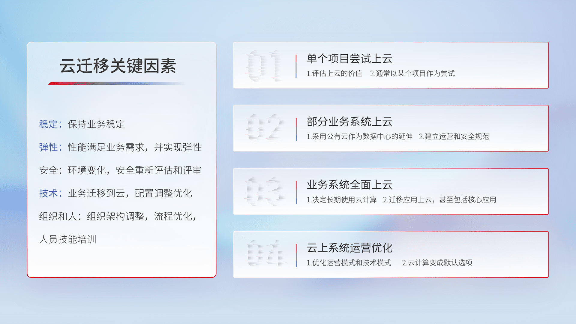 结合实际业务,,,从规划设计、、、、云平台选型、、、、云原生改造、、、、数据迁移、、、、集成交付,,迁移全过程为客户识别最佳上云路径,,做好风险识别管理,,,设计网络架构、、、身份权限、、安全审计合规、、、、操作审计、、日志审计、、监控告警策略、、、多站点容灾设计等,,,,对云上基础设施进行整体规划,,,提升IT治理水平,,,,以满足弹性、、高可用、、高性能的需求。。。