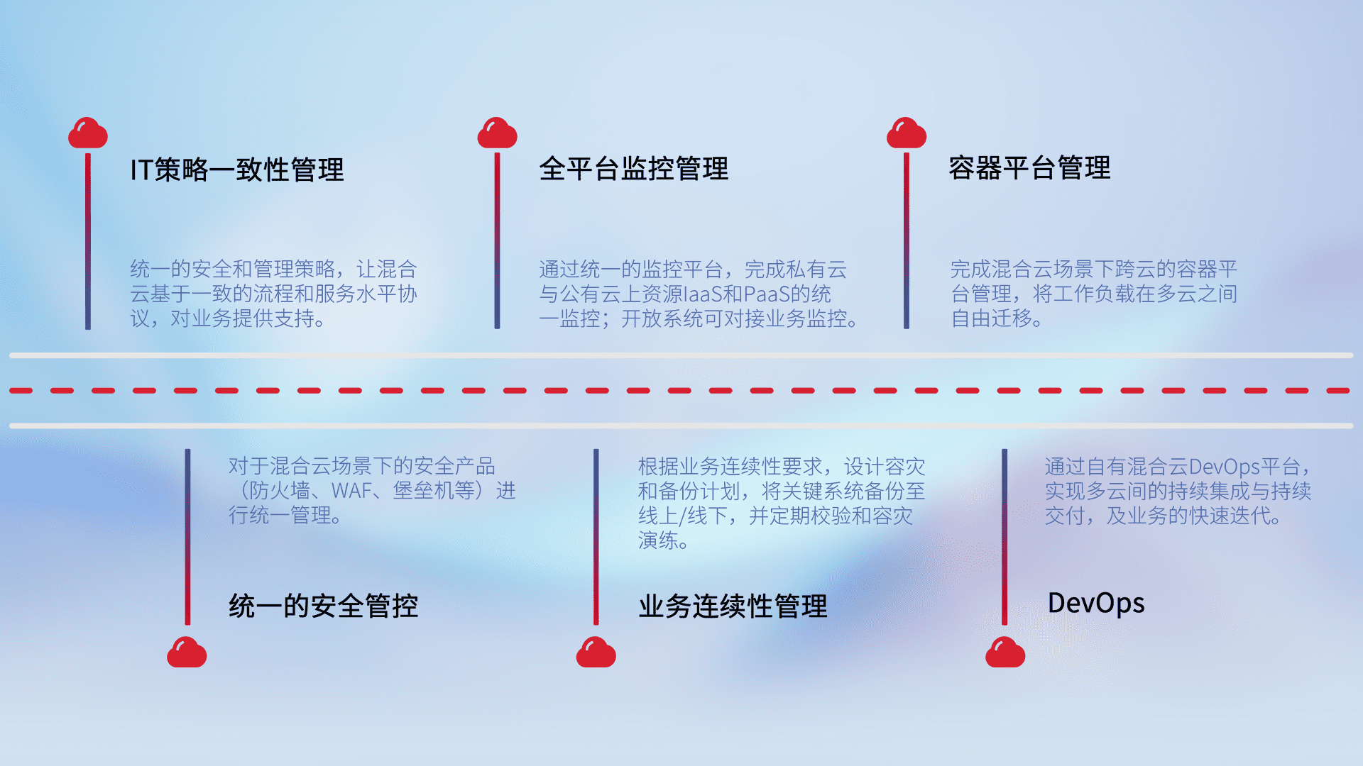 通过多云纳管,,以统一的资源数据模型把客户的云资源进行抽象和封装,,,进而实现对多云资源的统一操作,,保障云资源管理的可靠性、、、稳定性与可用性。。量身定制化运维内容,,配置、、、、开发运维、、、补丁管理、、、备份、、、监控、、、认证和访问管理、、审计和日常巡检等,,,,保障在用云过程中的可靠度,,稳定度以及高可用率。。